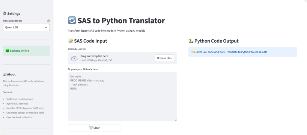 SAS-to-Python Translator is an interactive, research-driven application designed to demonstrate how artificial intelligence can translate, interpret, and modernize legacy SAS programs into equivalent Python implementations. The system moves beyond rule-based code conversion by leveraging semantic analysis, structural mapping, and context-aware transformation techniques to preserve computational intent, data workflows, and statistical logic across languages. This enables more reliable and maintainable migration compared to traditional line-by-line or syntax-only translators.